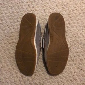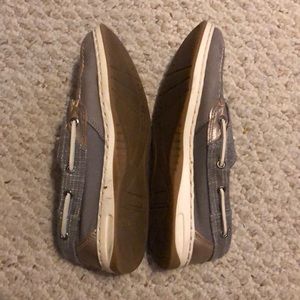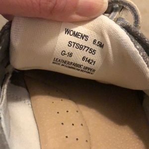 Sperrys in good condition. They are gray with a little bit of shimmer in the material. The size is 6.5. They were a little snug on me. I do not have the original box. Pet and smoke free home.
