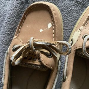 Sperry’s size 6.5. Small paint spot on the left shoe but can be washed off