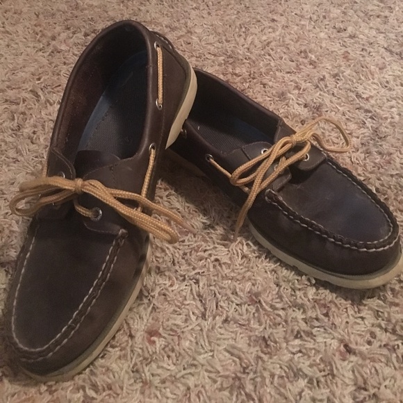 Dark brown leather Sperry’s top-siders with light brown laces. Gently used but in overall great condition.