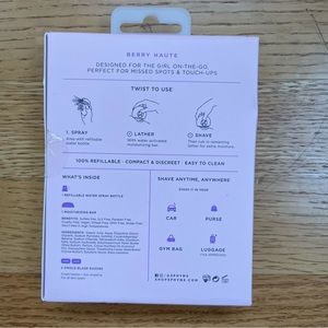 Refillable components include a water spray bottle, a Shea Butter moisturizing bar, and two triple-blade razor cartridges.
