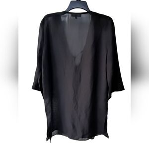 Spiaggia Dolce Black & Blue Embellished Vacation Beach Resort Swim Coverup L. This chic swim coverup showcases a black base adorned with striking blue embellishments in an asymmetrical design. The tunic-style silhouette with loose sleeves provides a comfortable and stylish fit, ideal for poolside relaxation. The ornate neckline adds a sophisticated touch to your swimwear collection. This is in very good pre-loved condition but it is missing one sparkle (please see pic number 9)