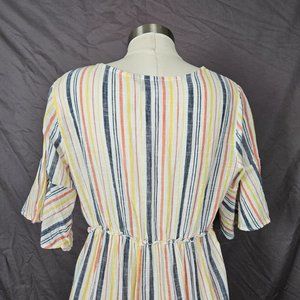 Preloved, great condition, white, black, yellow and orange strips, slightly sheer, gauze like feel, soft, elastic below bustline/waist, (about 1/4 " wide elastic) see pictures, flare sleeves and bottom of dress, no stains, rips or holes, see pictures for material content, condition and measurements.