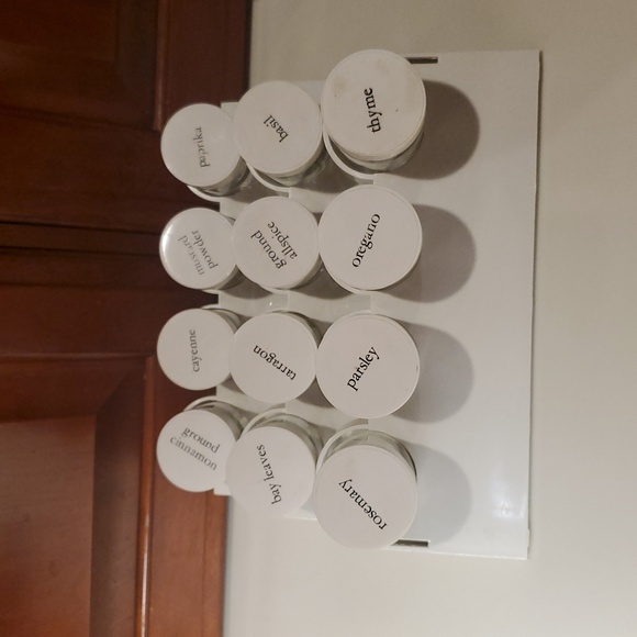 Pre-owned. Twelve jars labeled for common spices. Fits perfectly in drawer or cabinet.