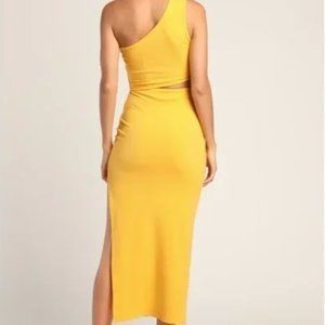 LULUS Dress Spice Things Up Ribbed One Shoulder Cutout Midi Dress in Yellow, with side cut out and slit.