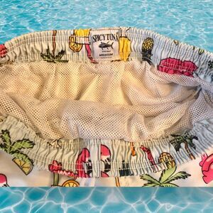 Spicy Tuna Men's Swim Trunks, Size Medium, Blue with Drinks, Palms, Flamingo's