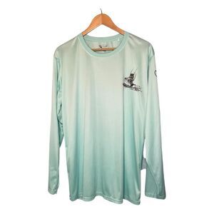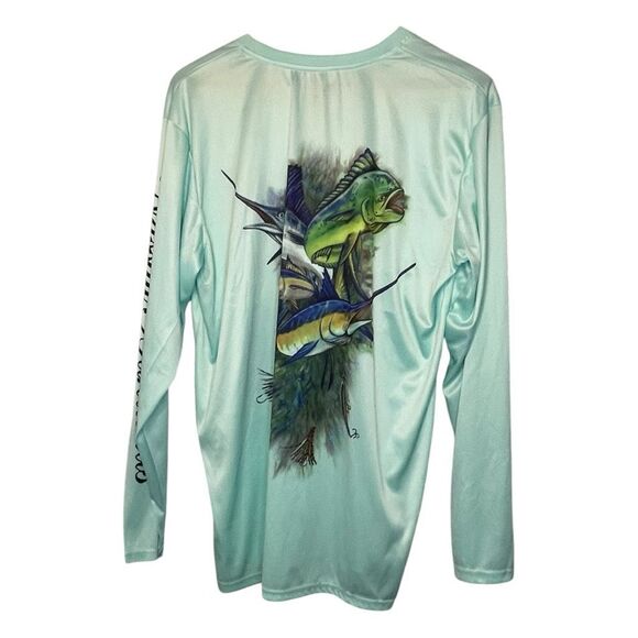 Spicy Tuna Nassau Bahamas Surf Tee in Turquoise Stretch Knit. It is long sleeve, crewneck and is a pull-over style, with a double sided fishing graphic print and Nassau Bahamas down the arm.