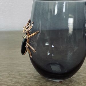 NWT stemless dark gray wine glass with sparkling gold metallic and black jeweled 3-D spider embellishment. May have multiple glasses available, please ask if interested.