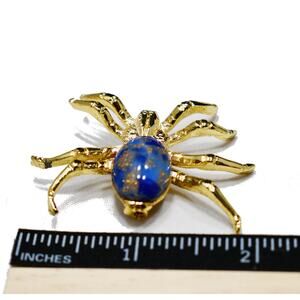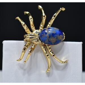 *Description: This is a great gold plated spider brooch with a blue Lucite cabochon body which has glitter inside, from the 1960s. This would be a great addition to your vintage jewelry collection or make a great vintage gift!