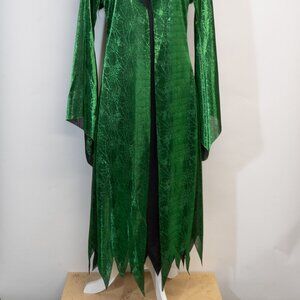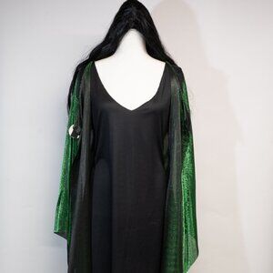 -The Spider Diva Black & Green Halloween Long Coat (50" long) and Dress (48" long) with Long Black Wig is a spooky chic outfit perfect for Halloween.