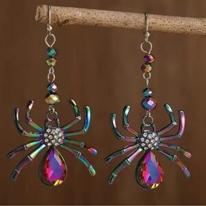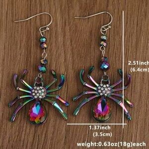 Add a touch of intrigue with these iridescent spider drop earrings. Perfect for making a bold statement.