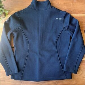 Spyder full-zip jacket in deep navy. Textured knit with a smooth collar. Long sleeves and zip front. Flattering cut.
