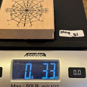 High-quality wood and rubber stamp featuring an intricate spider web design. Measuring 3" x 3 ", this durable stamp is perfect for crafting, scrapbooking, and seasonal projects.