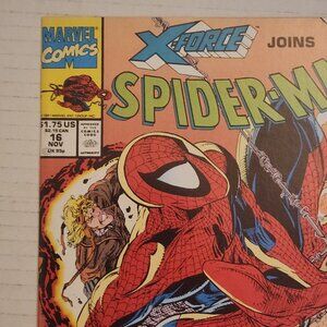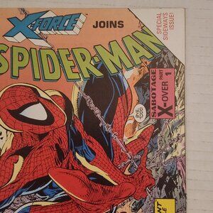 Direct Edition. X-Force crossover. "Sabotage" Part 1 of 2. Guest-starring X-Force. Script and art by Todd McFarlane. Plot assist by Rob Liefeld. Cover by Todd McFarlane. Plot continues from X-Force (1st series) #3. Superstar artist Todd McFarlane's spectacular run on the Spider-Man (1990) title comes to an end with a battle royal on the streets of lower Manhattan! The wall-crawler is web-swinging by the World Trade Center...when he stumbles across a major battle in progress between X-Force and the Juggernaut! Spider-Man knows Cain Marko is nigh unstoppable, but the youngsters of X-Force don't care! Can the web-slinger guide them to victory? Story concludes in X-Force #4. X-Force Lineup: Boom-Boom, Cable, Cannonball, Domino, Feral, Gideon, Shatterstar, Siryn, Sunspot, and Warpath. (Notes: This unique issue is drawn in widescreen/landscape format (horizontal) to maximize the action -- in the same manner as Fantastic Four 252.