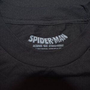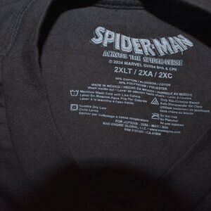The product is a Spider-Man Across The Universe men's big and tall T-shirt featuring a splatter logo. Made from a blend of cotton and polyester, this black shirt with a crew neck and short sleeves is perfect for fans of the Marvel Universe and Spider-Man. With a size 2XLT, this shirt is great for any fan looking to show off their love for the iconic superhero in a stylish and comfortable way.