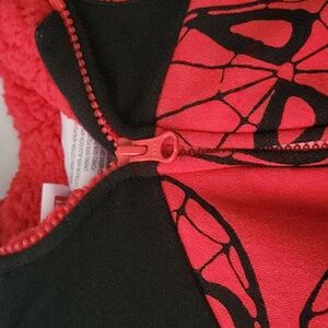 Cozy Spider-Man hoodie with red and black design. Features Spider-Man face patterns.