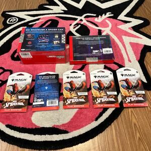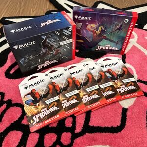 Authentic Magic: The Gathering Spider-Man crossover bundle lot. Includes one sealed Booster Bundle, one Collector Bundle, and one Play Bundle from the upcoming Marvel MTG series. Each bundle contains themed packs and accessories tied to the Spider-Man universe. Perfect for sealed collectors, TCG players, or fans of the Marvel x Magic collaboration.