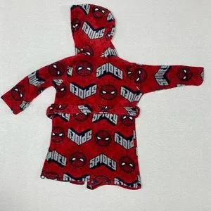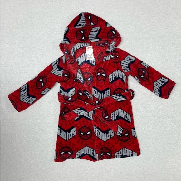 Boys Spider-Man robe. Brand Marvel. Size XS or 4 as listed on tag. Purchased new. Gently used. Only washed in Tide Free & Gentle detergent. Free of odor. Free of stains. Stored in a smoke free and pet free environment.