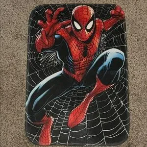 Vibrant Spider-Man themed rug featuring red and black colors. Perfect for fans and themed rooms.