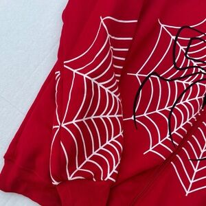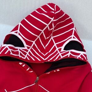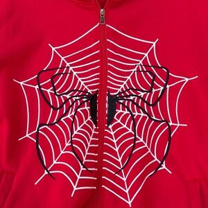 Bold red zip-up sweater with iconic spider web pattern. Perfect for fans of Spiderman.