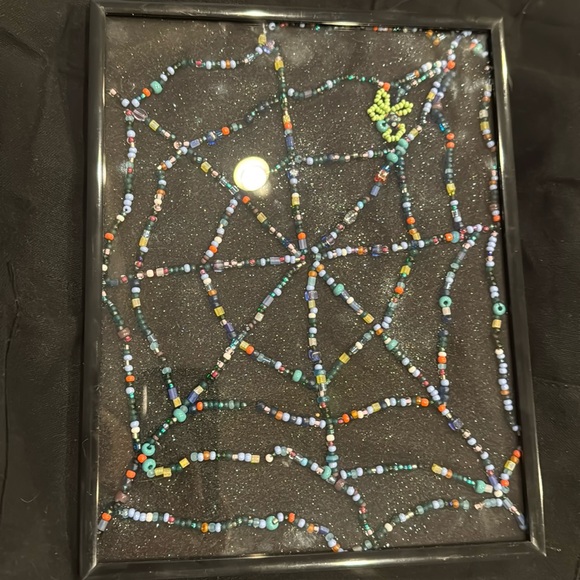 Mixed bead, spiderweb embroidery in frame, black glitter background