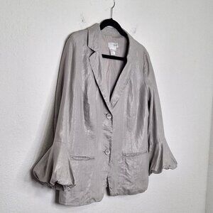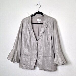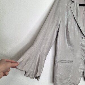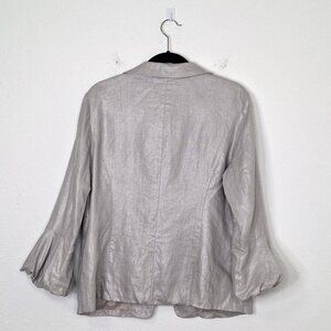 Pre-owned, good condition w/ minor flaws. Normal signs of wear. Gorgeous neutral 100% linen silver fabric with subtle metallic sheen. V-neckline w/ notch collar. Button closure. 3/4 sleeves with flared sleeves. Fully lined. It can be dressed up or down based on the occasion. Size per tag: 16. Fabric: Shell: 100% Linen. Lining: 100% Acetate. Size per tag does not guarantee desired fit, please see pictures for measurements.