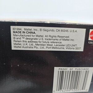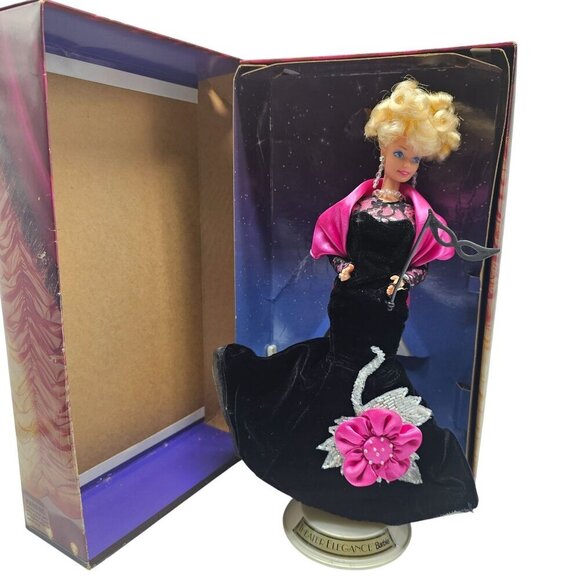 This limited edition Barbie from Spiegel epitomizes elegance with its exquisite evening gown and detailed accessories. Featuring a luxurious velvet dress and a vibrant pink floral accent, it's an ideal collectible for discerning Barbie enthusiasts. The attached stand and original box enhance display options, ensuring the doll remains a standout piece in any collection.