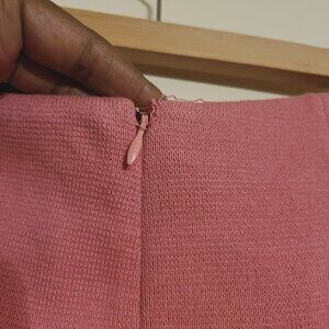 Women's vintage two-piece pink skirt suit set by Spiegel, size 10. The jacket has shoulder pads and buttons down the front; the skirt has a small slit in the back that is still sewn together.