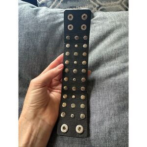 Width 2", Solid bracelet, all rivets are tight. Faux leather. Costume or daily wear.