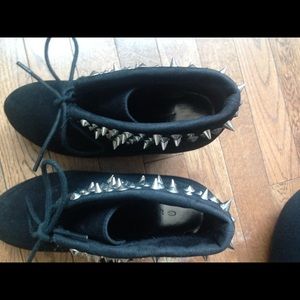 Great condition!! Barely worn. I stink at walking in heels and wedges only wore a couple times out to dinner. Super cute. Suede material all spikes in tact