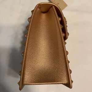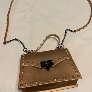 Spiked handbag and/or crossbody bag. NWOT. Kinda bronze color. Last photo is taken directly under a light. Smoke free & Pet free home. See ALL photos for complete description/details.