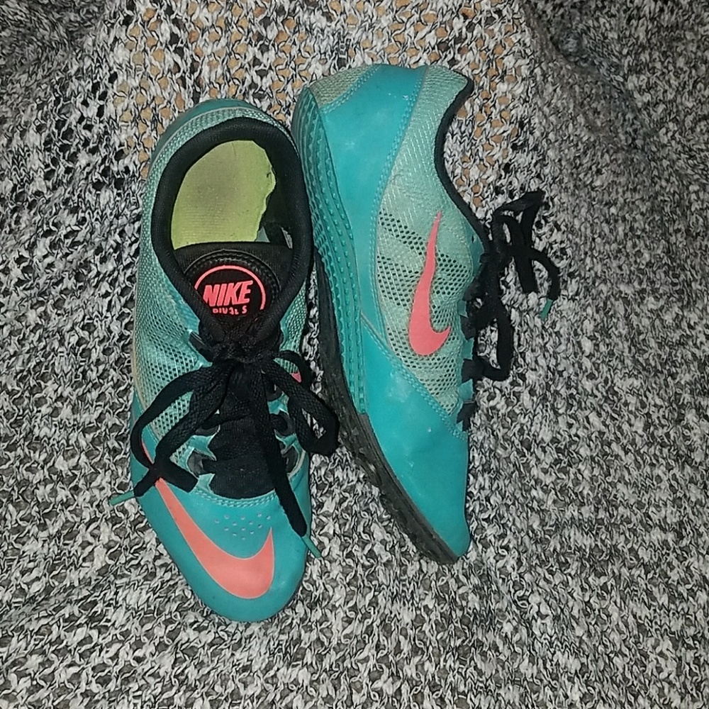 These beautiful pairs of track shoes are up for sale y'all. They are blue with pink nike symbols and yes a bit sandy too. I love these so much, theyre so comfy for what they are and yes yhey are a bit worn but still pretty nice.