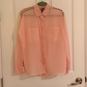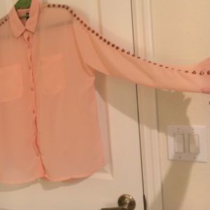 Soft pink top has buttons up and down. Loose and flowy. Up and down each sleeve are gold studs. Perfect as a cardigan or button up blouse.