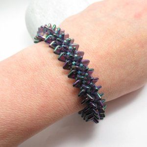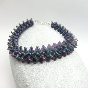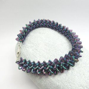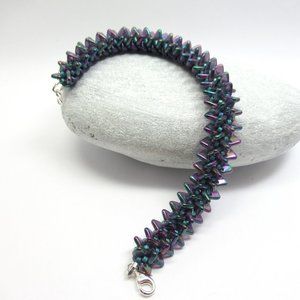 This listing is for the handwoven two hole triangle, two hole Superduo and seed bead bracelet pictured. This bracelet was handwoven by me using seed beads and two hole beads. The triangle shaped beads give it a 3d spiked shape. It is tanzanite purple, purple, and teal in color and finished with a 925 Sterling lobster clasp. This bracelet is 7.5 inches. It is new and one of a kind.