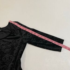 Spin Doctor black velvet dress, size XS. Features a soft stretch velvet fabric with an embossed damask pattern, 3/4 sleeves, and a flattering fit-and-flare silhouette. Perfect for gothic, dark academia, or vintage-inspired looks. Dress it up for a night out, Halloween event, or as a timeless statement piece.