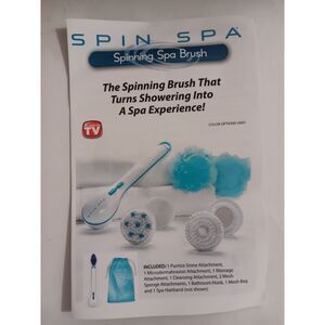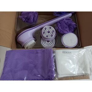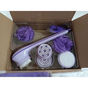 Electric Spin Spa Body Deluxe Cleansing Mega Bundle (Purple) The battery-operated Spin Spa Body Brush System gives you a head-to-toe spa experience. The dermabrasion brushes remove dry, dead skin cells to reveal fresh and glowing skin underneath. The massage brush soothes cramped and tired muscles, while the pumice-stone brush keeps knees, feet, and elbows smooth and soft. With an extra-long handle, it's easy to scrub hard-to-reach places, and the brush can be filled with any kind of liquid soap or body wash. What you get: 1)Electric Body Spin Spa Brush with extended Handle 1)Microdermabrasion Brush opens to fill with Shower Gel 1)Pumice Stone Attachment Cleansing Brush Attachment 1)Massage Brush Attachment 2) Mesh Sponge Attachments 1)Shower Hook with Suction Cup 1)Micro Fiber Hair Towel 1)Mesh Air Dry Travel Storage Bag Requires Battery:3 * AA (NOT included) Features: Pumice Stone Attachment Condition: New With Box