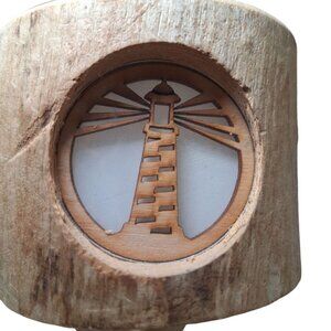 Handcrafted wooden lighthouse nightlight from Spinning Aspen Studio, Canon City, Colorado. Perfect for adding a warm glow to any room. Unique art piece with intricate detailing, showcasing skilled craftsmanship.