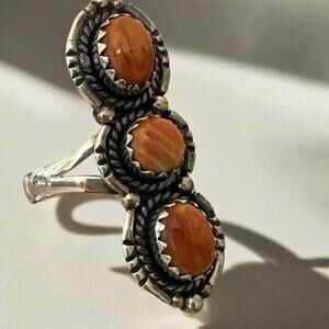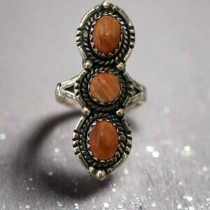 Spiny Oyster Three Stone .925 Sterling Silver Southwestern Ring Size 8.5