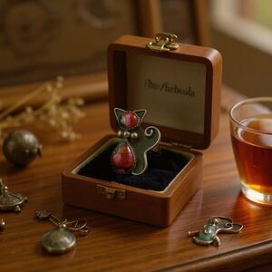 The vibrant Spiny Pink Dahlia turquoise stones add a pop of color and bring out the intricate details of the cat design.