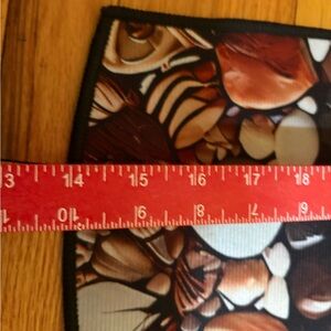Half circle rug with a spiral seashell pattern. Features shades of brown, tan, and cream.