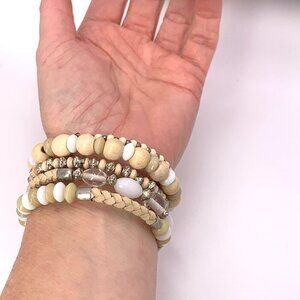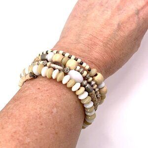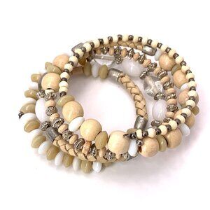 Spiral Wrap Bracelet Wood Beads Braided Silver White & Natural Wood OS
