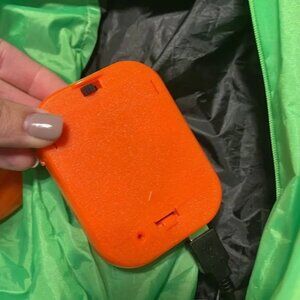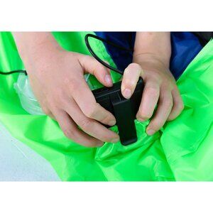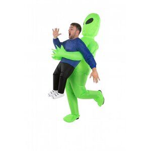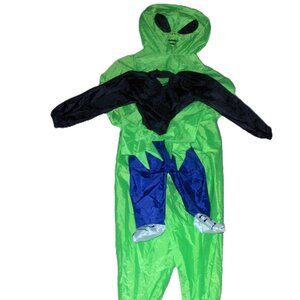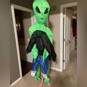 Exciting inflatable costume with alien design. Bright neon green and navy colors. Perfect for Halloween fun.