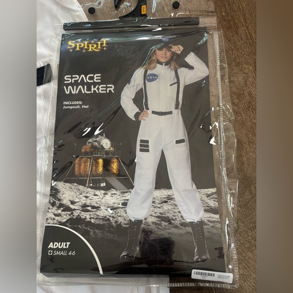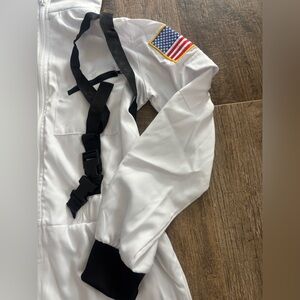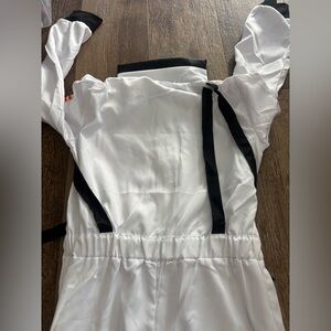 White astronaut jumpsuit with black accents. Includes matching hat.