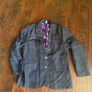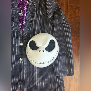 Stylish Jack Skellington suit. Includes jacket, pants, bow tie, and mask. Perfect for themed events. Preowned. Only used once. Hasn’t been washed and has food stain on one sleeve and a spot on the front of the blazer.