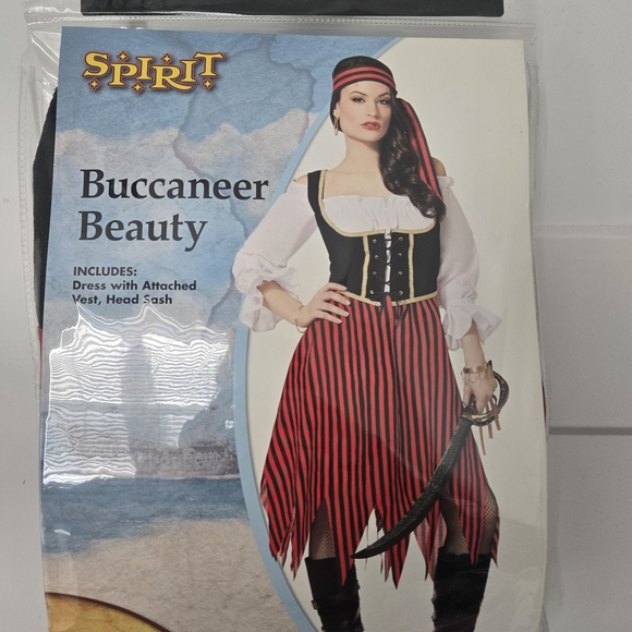 Pirate outfit featuring a striped dress and head sash. Includes attached vest.