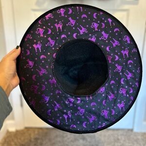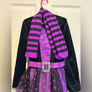 Charming witch costume with a purple and black dress, matching hat, and striped tights. Ideal for Halloween fun.