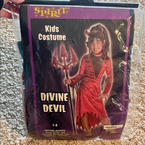 Spirt Halloween divine devil costume girls size 7-8. Comes with dress and neck collar. Also had devil headband but is broken in middle. Could be fixed. Good condition!
