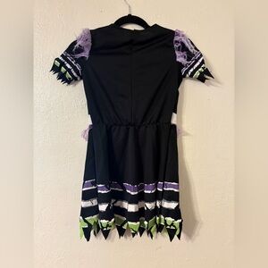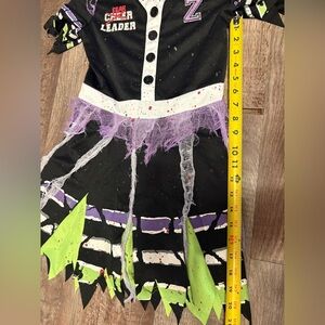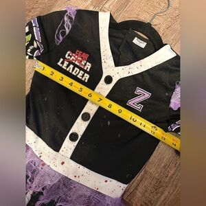 Spooky cheerleader outfit with black and purple colors. Features tattered details and bold design. Perfect for Halloween fun.