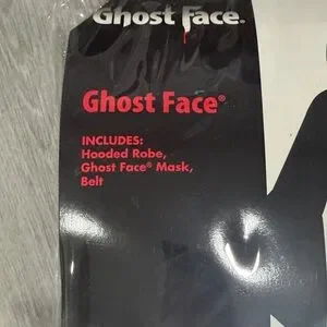 Spooky Ghost Face costume from Spirit. Includes hooded robe and signature ghost mask. Classic scary look for Halloween and dress-up. Easy to put on and wear.