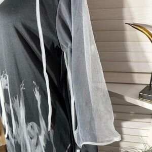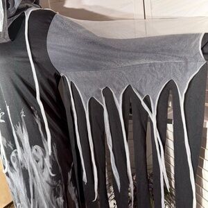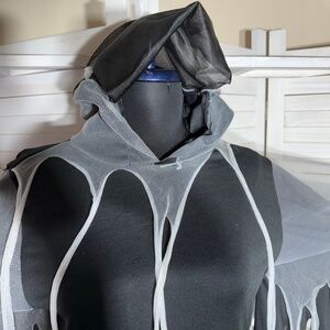 This Spirit Ghoul costume features ghostly soul graphics, tattered sleeves, and a draping mesh hood. This pull-on costume is perfect for embodying a soul eater or reaper-like figure. A spooky choice for parties, haunted houses, or trick-or-treating.
