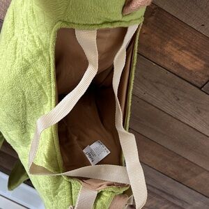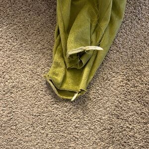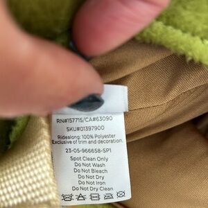 Fun dinosaur costume for kids. Green body with tan accents. Easy to wear and comfortable. The feet have been cut off so it would fit my two year old with his boots. Age 2-7 is what i was told! Fit my two year old and was large .